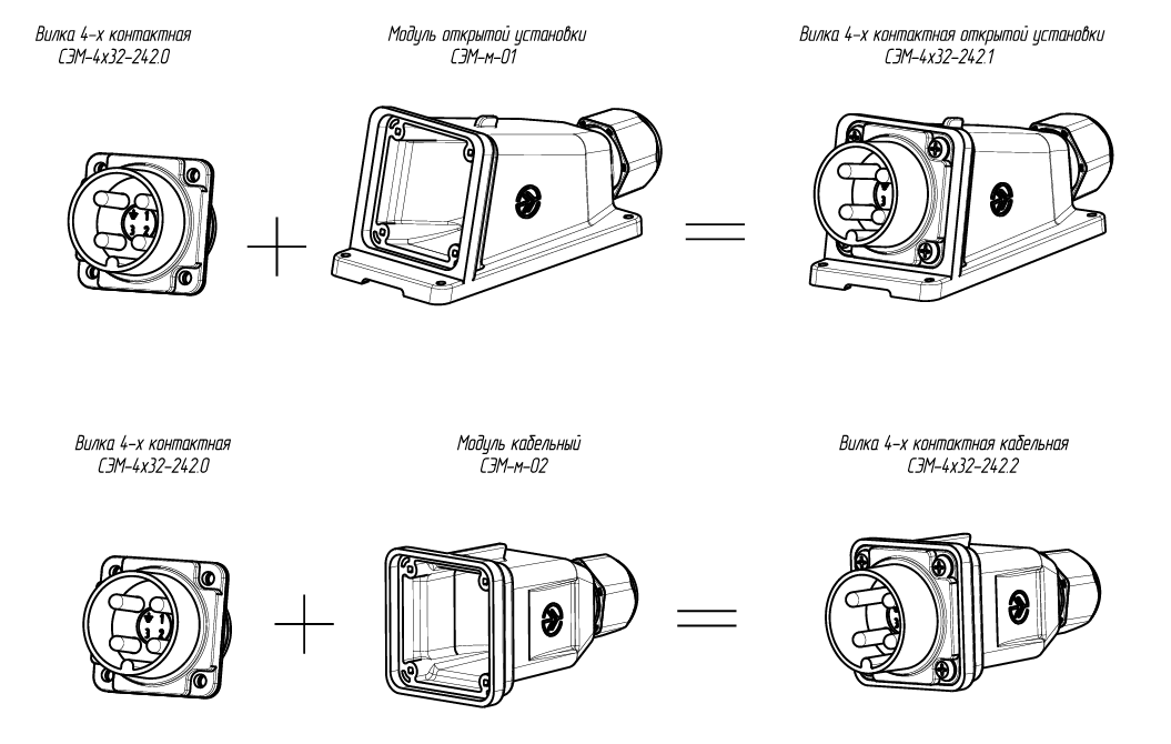 Одинаковые присоединительные размеры позволяют из стандартного набора компоновать и выстраивать любые варианты подключений и соединений — штепсельных, кабельных, вводных и комбинированных.