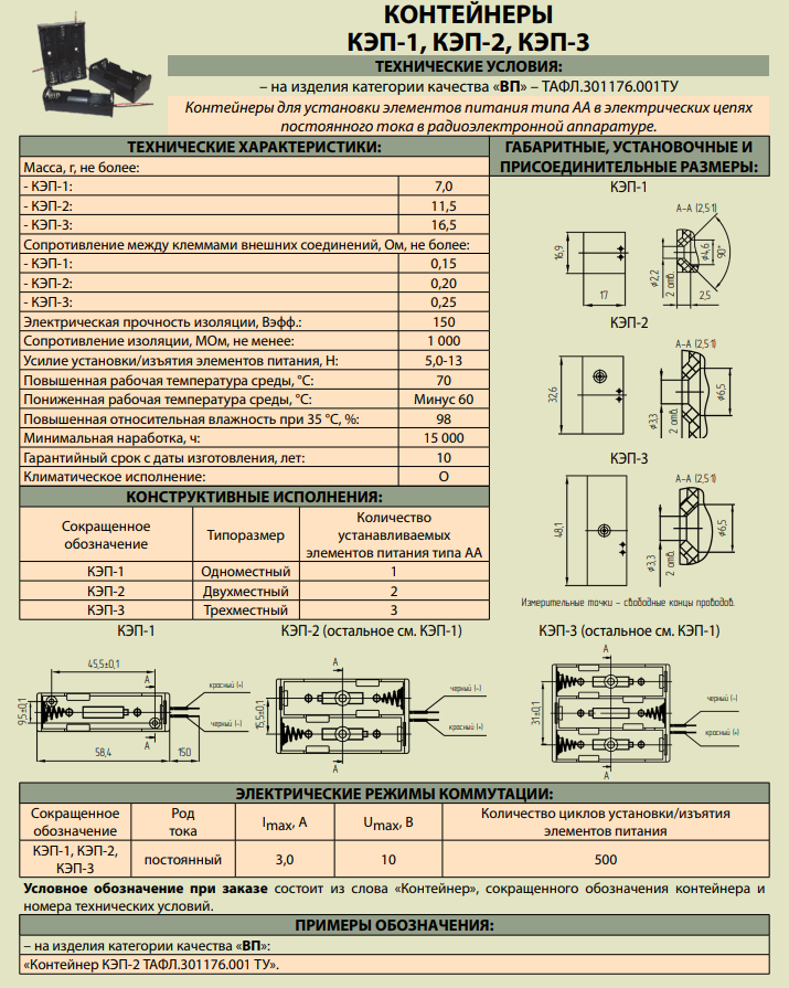 Контейнеры для установки элементов питания типа АА в электрических цепях постоянного тока в радиоэлектронной аппаратуре.