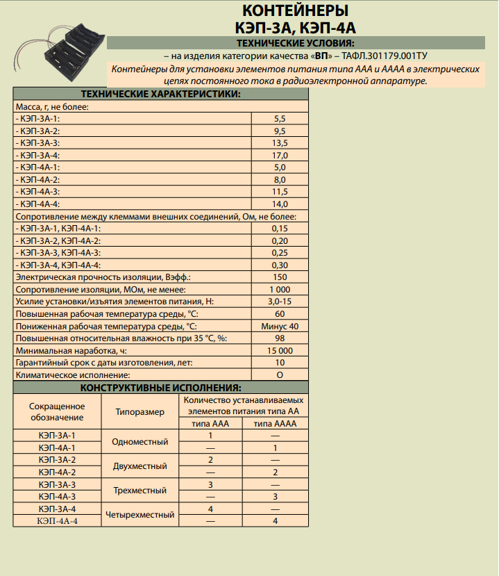 Контейнеры для установки элементов питания типа ААА и АААА в электрических цепях постоянного тока в радиоэлектронной аппаратуре.