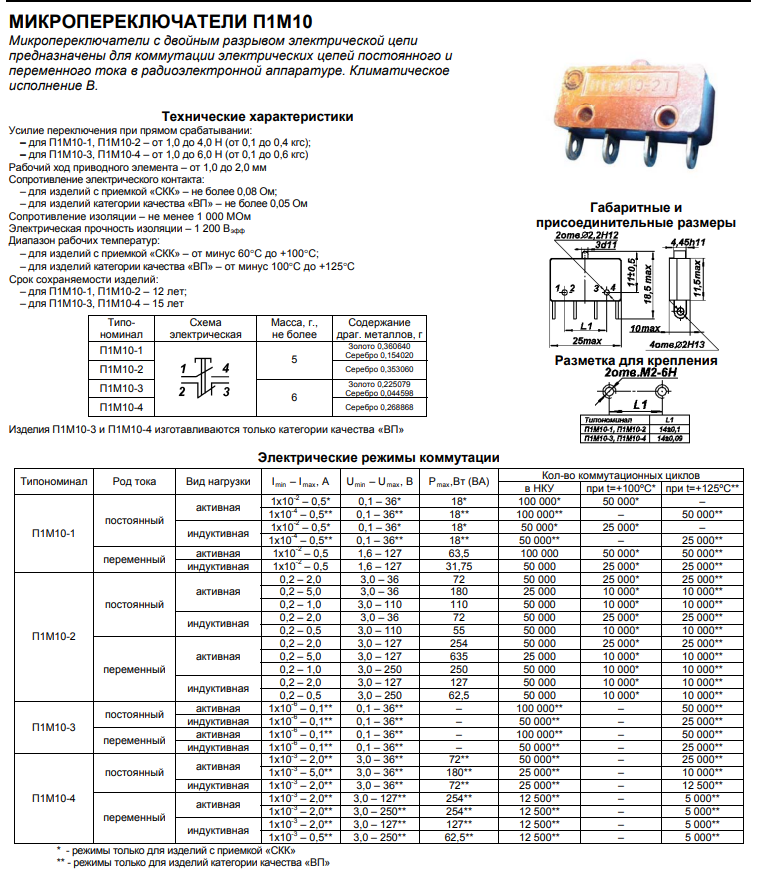 Микропереключатели П1М10 с двойным разрывом электрической цепи предназначены для коммутации электрических цепей постоянного и переменного тока в радиоэлектронной аппаратуре