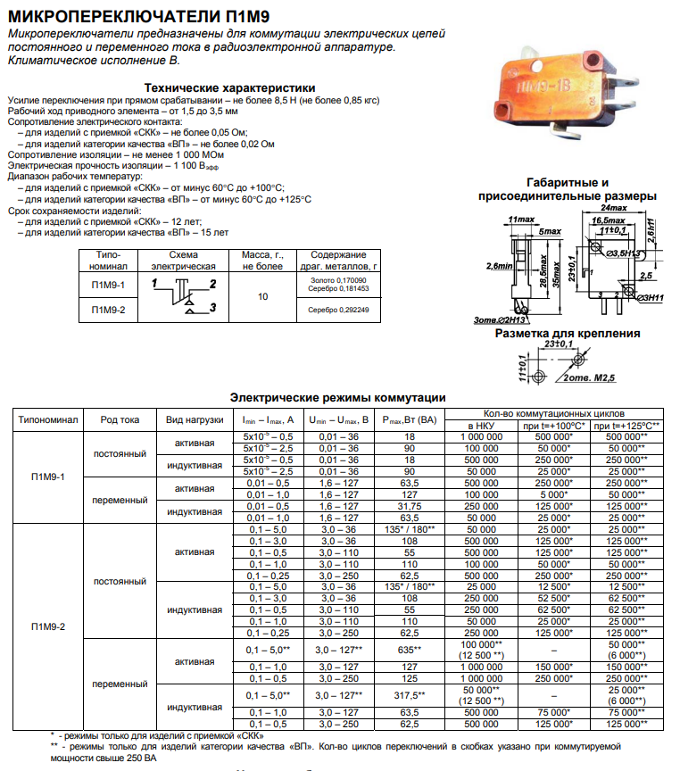 Коммутируемый ток от 5х10-5 до 5,0 А при напряжении от 0,01 до 250 В