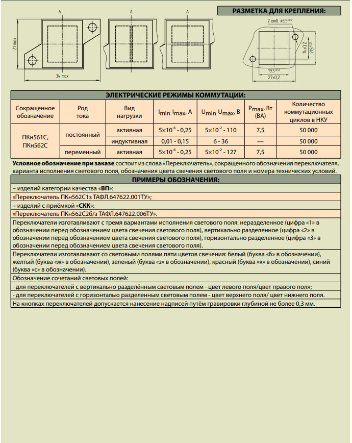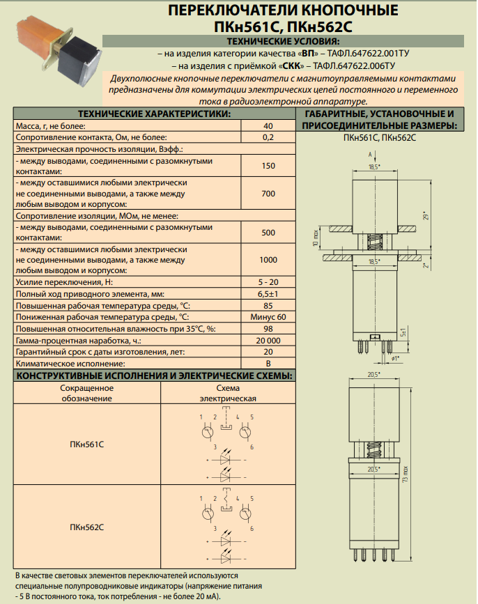 ПКн561 -двухполюсные кнопочные переключатели с магнитоуправляемыми контактами предназначены для коммутации электрических цепей постоянного и переменного