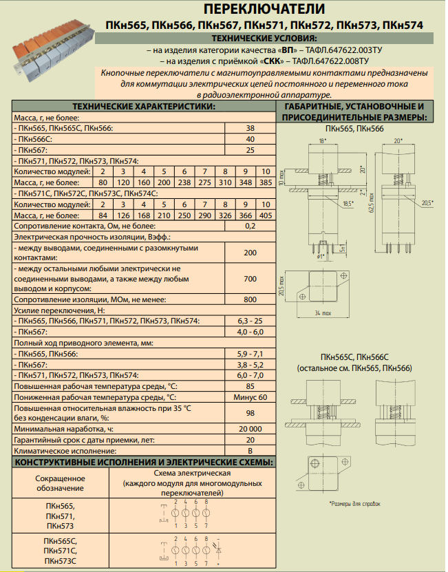 ПКн567 -кнопочные переключатели с магнитоуправляемыми контактами, в том числе со световой индикацией, предназначены для коммутации электрических цепей постоянного и переменного тока в радиоэлектронной аппаратуре.