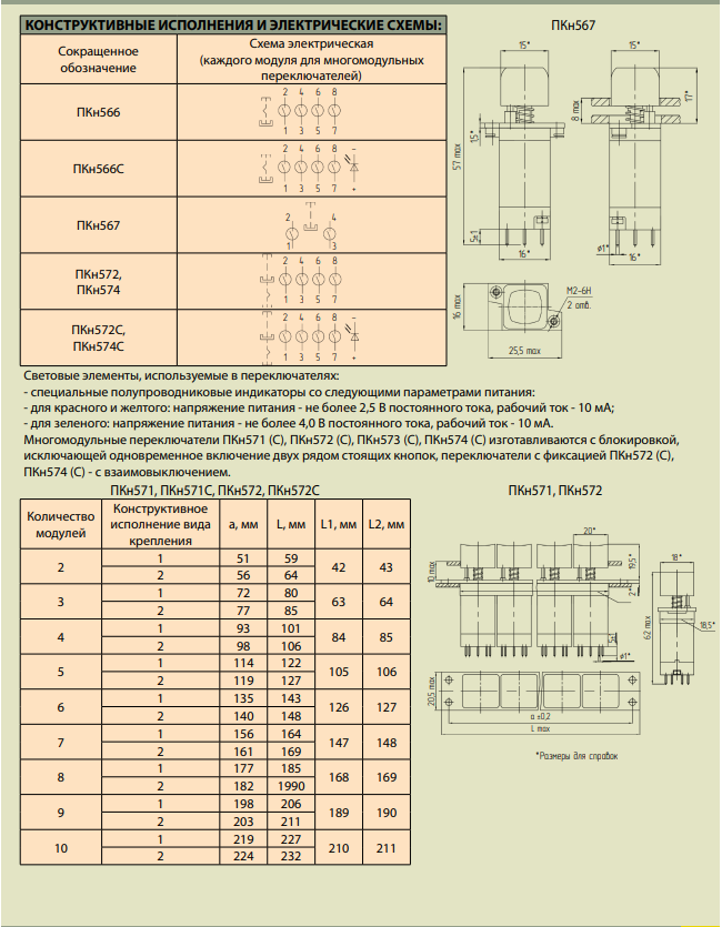 ПКн572 -кнопочные переключатели с магнитоуправляемыми контактами, в том числе со световой индикацией, предназначены для коммутации электрических цепей постоянного и переменного тока в радиоэлектронной аппаратуре.
