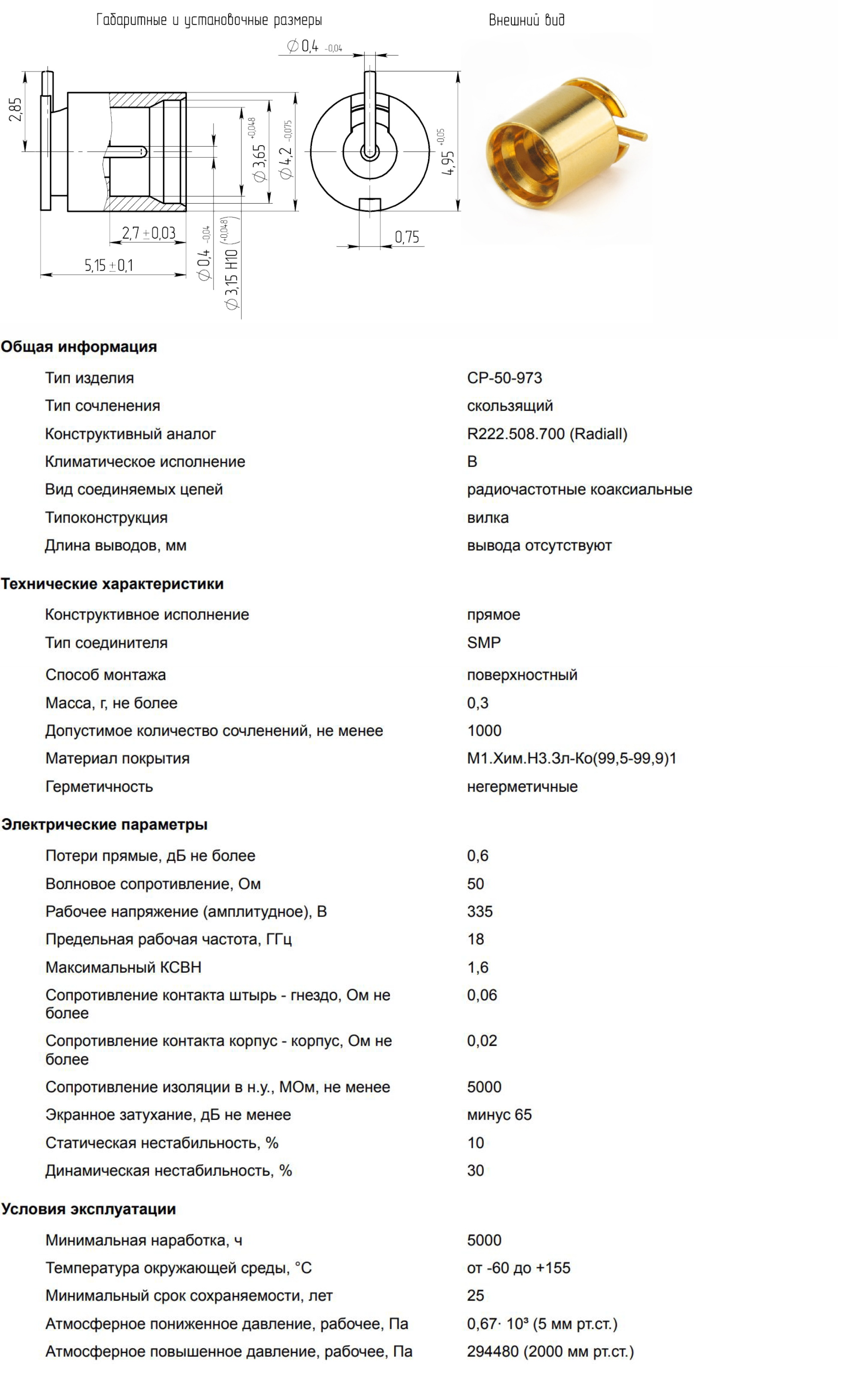 Сочленяются с ответными розетками типа SMP и переходами типа SMP защелкиванием.